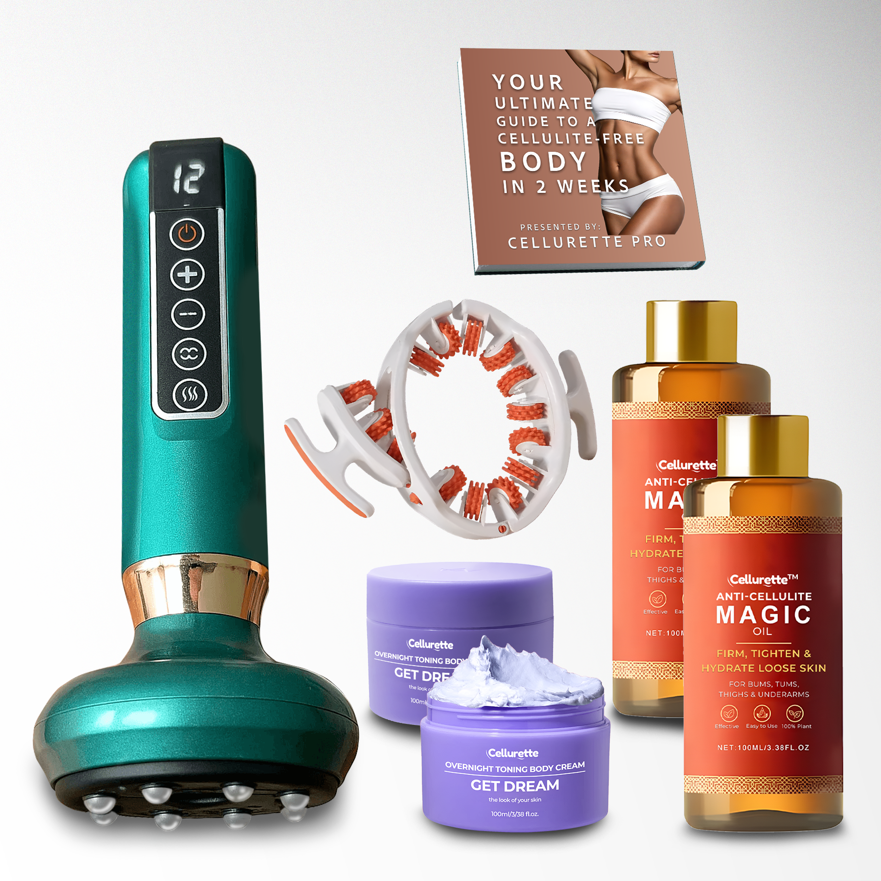 Includes the Cellurette Pro Massager, CelluGlow Roller, 2x Anti-Cellulite Magic Oil (100ml), and 2x Cellurette Night Toning Cream, all designed to smooth, tone, and rejuvenate your skin.